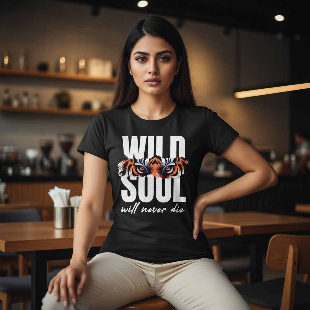 Part of our latest trendy t-shirt collection, this black quote tee is a must-have for anyone seeking to make a bold statement. Crafted from premium, ultra-soft cotton, it ensures supreme comfort and durability, perfect for your everyday adventures or inspiring moments. The powerful "Wild Soul Will Never Die" graphic is printed with precision, ensuring the message stands out vividly against the sleek black fabric.